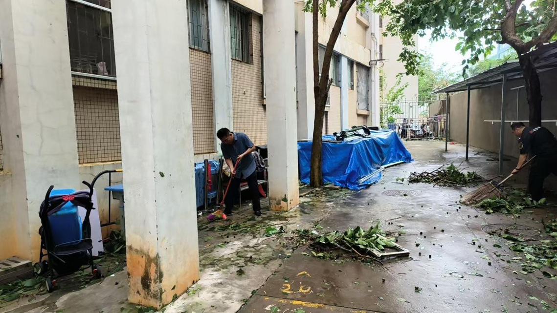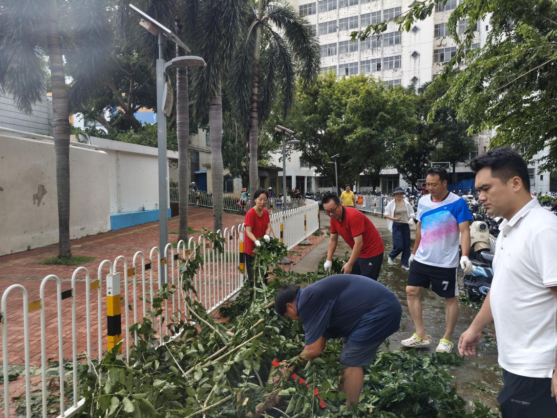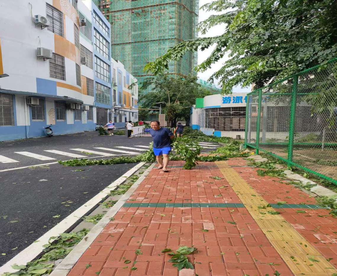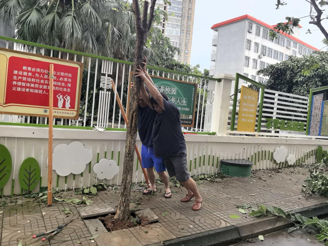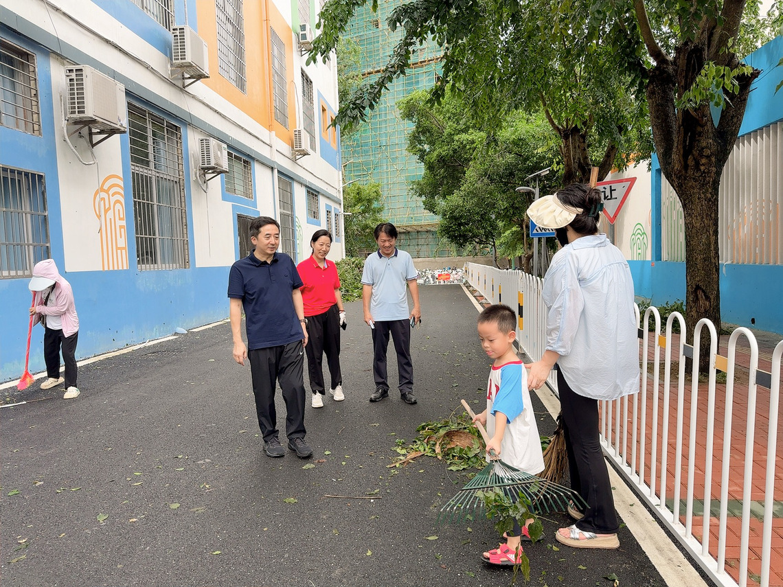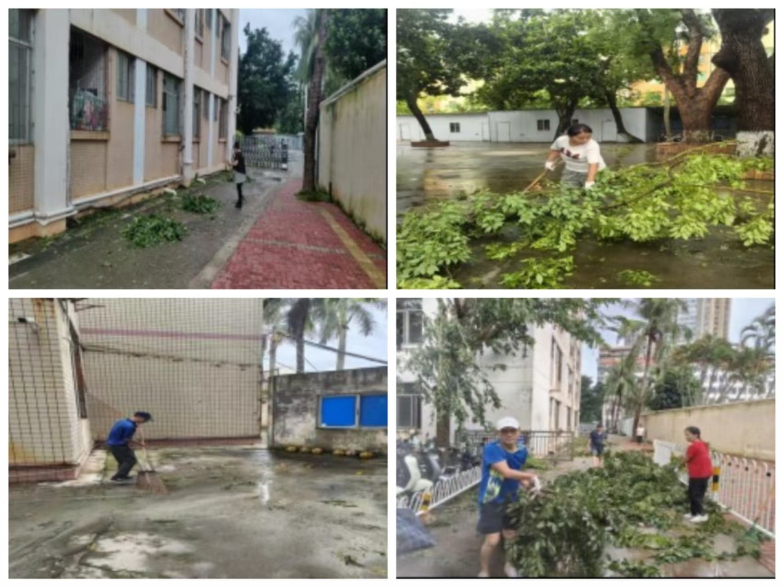 台风过后,校园内随处可见倒伏的树木枝叶、淤积的污泥和杂物,部分设施也受到不同程度的影响。按照海师大校长专题会议要求,附小党支部书记、校长梁胜娟带领学校班子成员,积极组织在海口的教职工迅速返校,高效开展灾后清理修复工作。大家分工明确,默契配合:有的挥动扫帚清理落叶断枝,有的手持高压水枪冲洗地面淤泥,有的合力扶正加固被风吹倒的绿植,有的仔细检查电路、教学设备的安全状况……汗水湿透了衣背,但没有人叫苦叫累,心中只有一个共同的信念——尽快让校园恢复原貌,为孩子们提供一个干净、安全的学习环境。