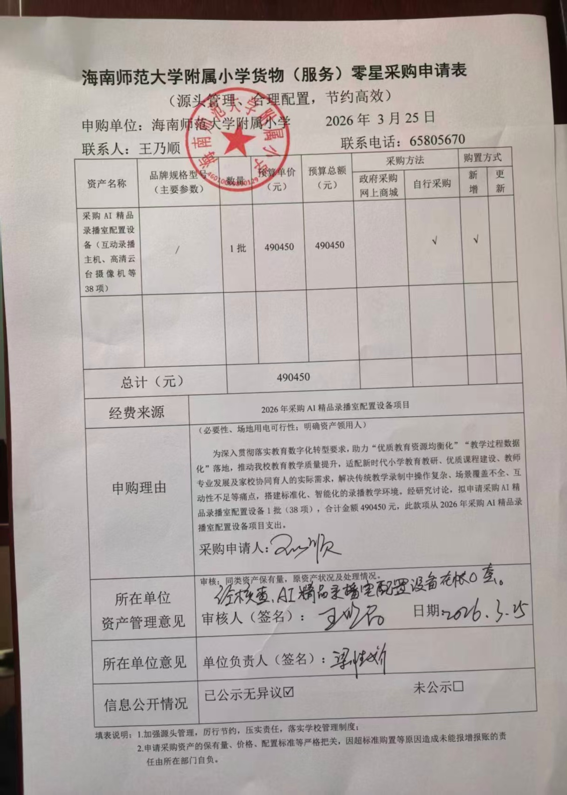 为深入贯彻落实教育数字化转型要求,助力"优质教育资源均衡化""教学过程数据化"落地,推动韩国a片 教育教学质量提升,适配新时代小学教育教研,优质课程建设,教师专业发展及家校协同育人的实际需求,解决传统教学录制中操作复杂,场景覆盖不全,互动性不足等痛点,搭建标准化,智能化的录播教学环境。经研究讨论,拟申请采购AI精品录播室配置设备1批(38项),合计金额490450元。